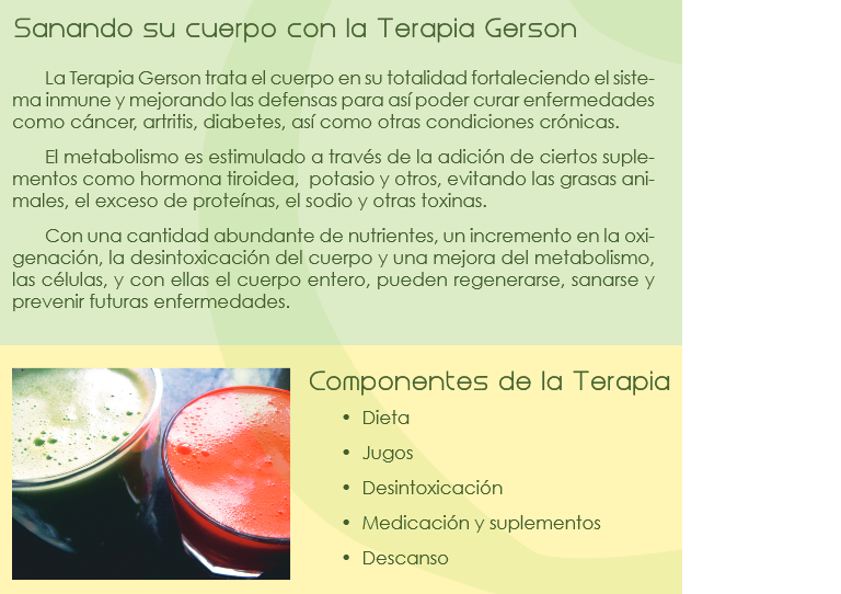 La Terapia Gerson es un poderoso tratamiento natural que fortalece el sistema inmunitario, para así poder curar cánceres, artritis, enfermedad coronaria, alergias, y muchas otras enfermedades degenerativas.La Terapia Gerson busca regenerar el cuerpo para recuperar la salud, apoyando cada requerimiento nutricional importante inundando el cuerpo con los nutrientes de casi 9 kilos de frutas y vegetales orgánicos. La mayor parte se utiliza para hacer jugos frescos, un vaso por hora, 13 veces por día.